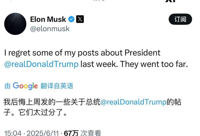 马斯克与特朗普的口水战有了新进展,马斯克刚刚在社交平台发文称:“我后悔上周发的一些关于总统特朗普的帖子。它们太过分了。”