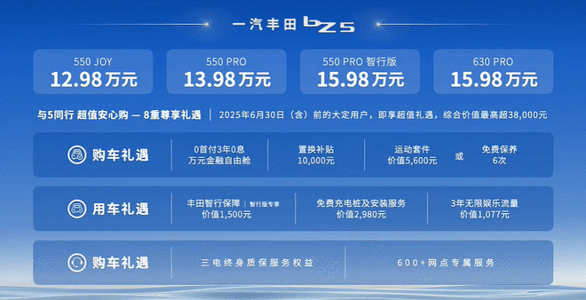 用车礼遇:丰田智行保障(价值1500元)、免费充电桩及安装服务(价值2980元)、3年无限娱乐流量(价值1077元);