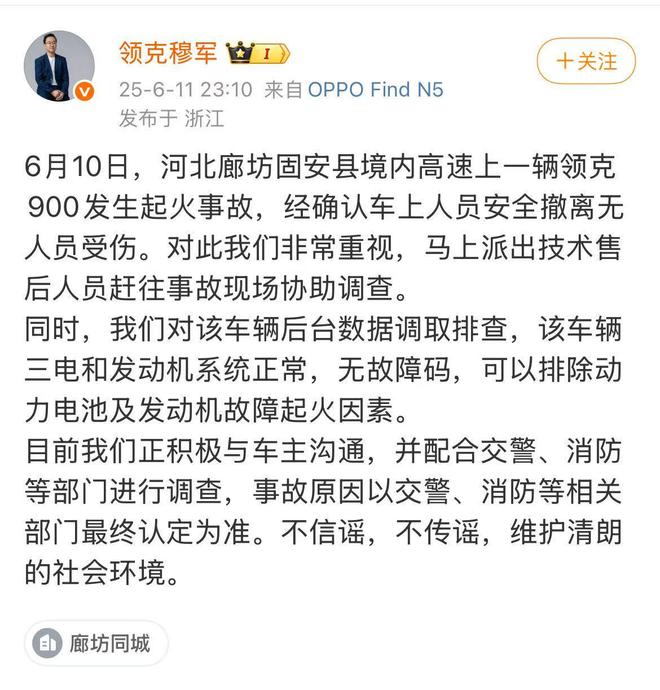河北领克900高速起火,领克高管回应:三电及发动机正常
