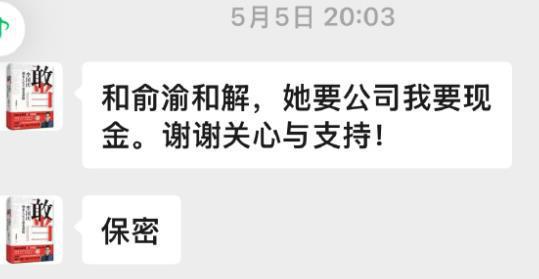 三言科技发现,李国庆一位友人也发出二人聊天记录,5月5日李国庆说:和俞渝和解,她要公司,我要现金,谢谢关心与支持。李国庆还嘱咐这位友人保密。