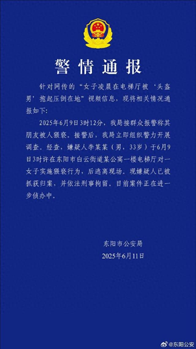 6月11日23时许,浙江东阳公安发布警情通报。针对网传的“女子凌晨在电梯厅被‘头盔男’抱起压倒在地”视频信息,通报如下: