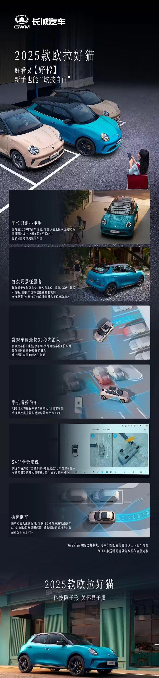 在智能配置方面,2025款欧拉好猫其智能泊车辅助功能支持超过100种泊车场景,车位识别正确率高达95%,常规车位最快30秒内即可完成泊入,无论是狭窄街道边的停车位还是大型停车场的斜列车位都能轻松应对。车辆搭载了ORAPilot 3.0智能驾驶辅助系统,具备L2级别自动驾驶能力,支持自适应巡航、车道保持、车道居中保持等11项主动安全功能,为驾驶者提供全方位的安全保障。