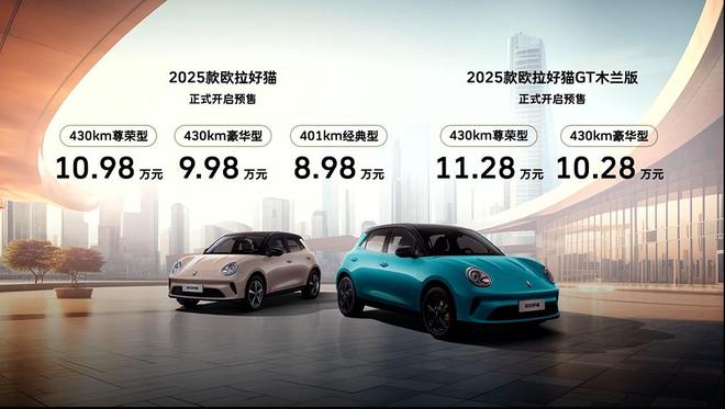 6月12日报道长城汽车旗下欧拉品牌的小型车——2025款欧拉好猫今晚正式开启预售,预售价区间为8.98-10.98万元,新车共推出3个版本,401km经典型、430km豪华型、430km尊荣型。同时2025款欧拉好猫GT木兰版也开启预售,预售价区间为10.28-11.28万元,分别为430km豪华型和430km尊荣型。作为改款车型,2025款欧拉好猫在外观设计、智能配置、动力续航等方面进行了全面升级。