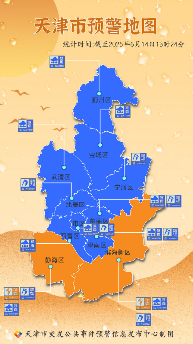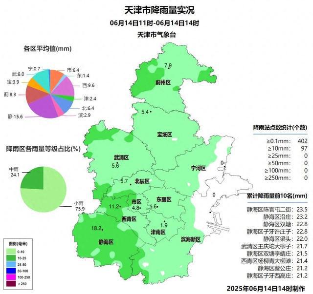 截至14日14时,全市平均降雨量6.9毫米,最大降雨量23.5毫米,出现在静海区陈官屯二街,最大小时降雨量22.7毫米,出现在静海区沿庄。中心城区平均降雨量6.4毫米,最大降雨量15.5毫米,出现在红桥区潞河园。