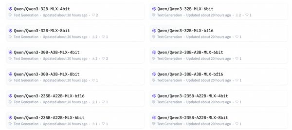 据悉,阿里巴巴此次推出基于MLX框架深度优化的全部Qwen3系列模型,每款模型都有4bit、6bit、8bit和BF16等4种不同精度的量化版本。
