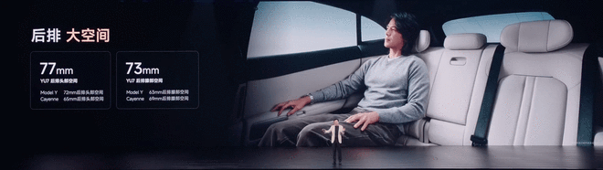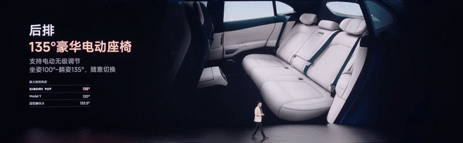 内饰配色方面,小米YU7拥有松石灰、珊瑚橙和暮影蓝三种,在舒适度和空间的考量上,新车也是做了多项优化设计,前排加入了双零重力座椅,并支持一键躺倒和10点座椅按摩。另外,座椅采用12层结构,提供了更佳的舒适性和包裹性等,并贴合人体省力曲线。空间上,按1.88米的模拟乘员来看,后排头部余量空间有77mm,膝部空间余量73mm,同时后排也支持电动无极调节的躺靠,角度在100°-135°之间。