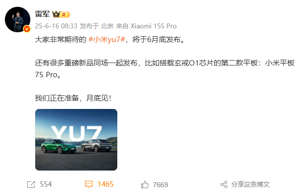 6月16日报道 今日早间,雷军借微博平台开始了小米YU7的预热造势:大家非常期待的小米YU7将于6月底发布,还有很多重磅新品同场发布,比如搭载玄戒O1芯片的第二款平板:小米平板7S Pro。除了价格,大家也在评论区猜测新品发布的具体时间,看来下周的后半程,车圈又该热闹起来了。