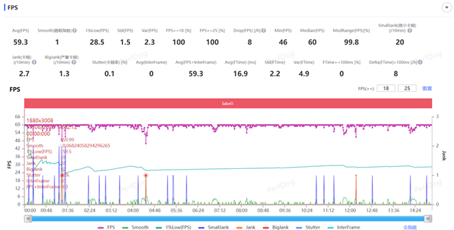 接着我们测试了负载更高的《崩坏:星穹铁道》手游,在最高画质下特效拉满,进行一局15分钟黄金的时刻跑图测试,游戏平均帧率59.3FPS,虽然游戏期间出现了较为频繁的帧率波动,但好在对游戏画面的流畅度没有造成割裂感。