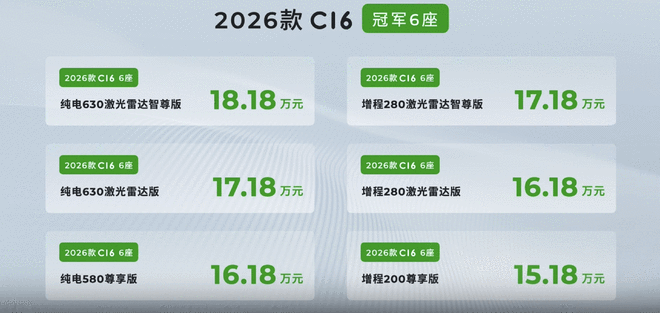 6月18日报道今日,2026款零跑C16正式上市。新车售价区间为15.18万元--17.88万元,共计推出8款车型,下定限时享至高价值21180元上市礼遇+四项终身免费质保。此次2026款零跑C16在舒适、续航、智能及设计等70+项产品功能上带来升级。除了保留原有的六座版本,还首次添加了五座版本选择。新车全系标配激光雷达,前、后排座椅支持通风按摩,增程版搭载38.7kWh电池组,纯电续航达到280km,CLTC综合续航为1150km。