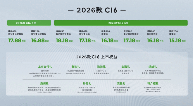 除了继续保留6座版车型之外,26 款C16还推出了5座版车型,后排的空间会更大,满足不同用户的需求。