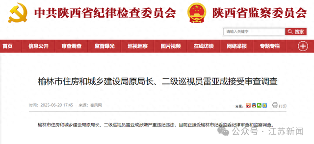 2025年6月20日,陕西省榆林市纪委监委通报:榆林市住房和城乡建设局原局长、二级巡视员雷亚成涉嫌严重违纪违法,目前正接受榆林市纪委监委纪律审查和监察调查。