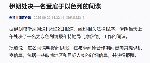 据伊朗塔斯尼姆通讯社22日报道,经过相关法律程序,伊朗当天上午处决了一名为以色列情报和特勤局(摩萨德)工作的间谍。