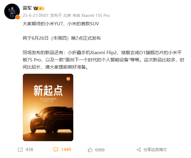 6月23日报道今日早间,雷军在微博正式官宣:大家期待的小米YU7,小米首款SUV,将于6月26日(本周四)晚7点正式发布。同场发布的新品还有:小折叠手机Xiaomi Flip2、搭载玄戒O1旗舰芯片的小米平板7S Pro、以及一款“面向下一个时代的个人智能设备”等等。随着小米新品的发布,可以预测到的是“疯狂星期四”又将热闹非凡。