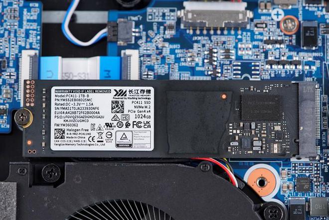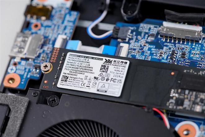 右侧已安装了一条来自长江存储的PC411 1TB SSD,并覆盖有白色的导热胶,左侧无线网卡正上方还有一个空置的2280规格SSD安装位。
