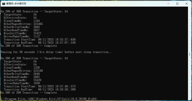 使用Windows系统自带的PWRTEST命令行工具,每次睡眠30秒后强制唤醒,共计睡眠唤醒300次,全部正常完成,没有发生任何错误。