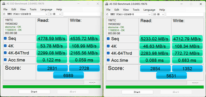 在1GB容量的测试中,AS SSD Benchmark总分为6989,最高顺序读取、写入速度分别为4778MB/s、4535MB/s,4K随机读写速度为53MB/s、108MB/s。10GB容量测试总分为5631,最高顺序读取、写入速度分别为5233MB/s、4712MB/s,4K随机读写速度为46MB/s、108MB/s。