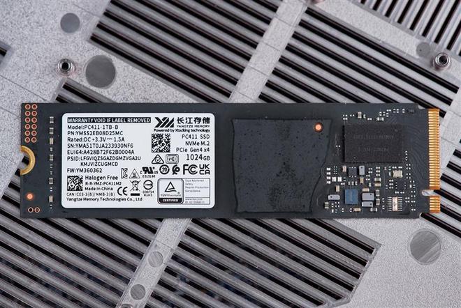 长江存储PC411 1TB SSD特写,单面设计所有元件都集中在正面,更方便布置散热片有利于散热。