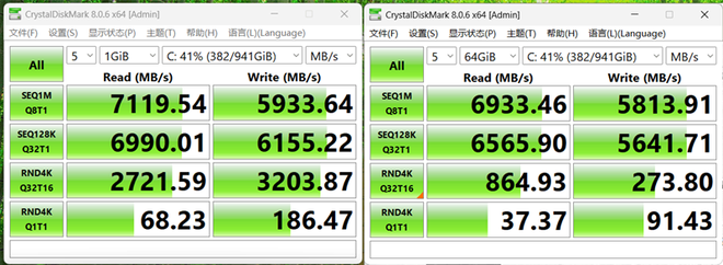 在进行64GB测试时,读写速度依然能达到6933MB/s和5813MB/s。