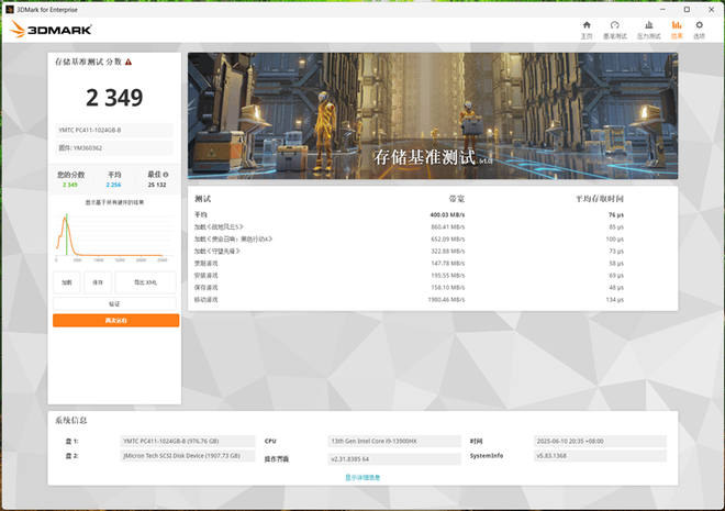 PC411 1TB SSD总分是22349分,,平均带宽400MB/s,移动游戏时,带宽能达到1980MB/s,平均存取时间76微秒,性能表现超过了3DMark数据库中所有SSD的平均值。