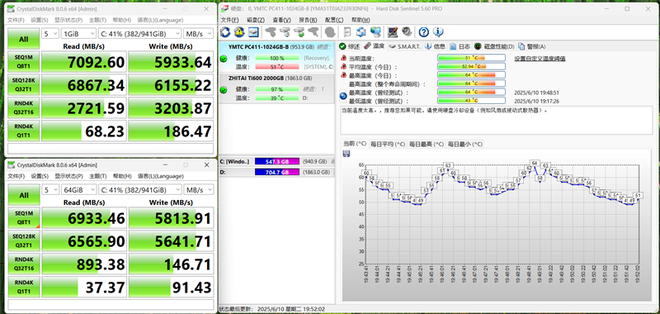 在CrystalDiskMark测试中,PC411 1TB的顺序读取速度达到了7100MB/s,写入速度也有5933MB/s;4K随机读取68MB/s,4K随机写入186MB/s。