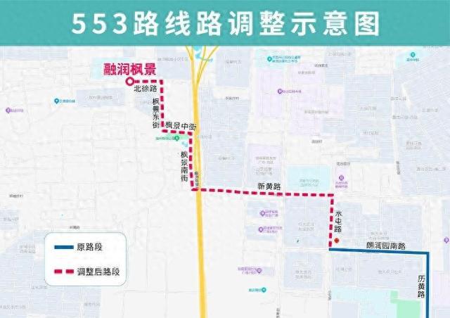553路优化调整后由地铁北园站开往融润枫景,沿朗润园南路向西、水屯路向北、新黄路向西、枫景南街向北、枫景中街向西、枫景东街向北、北徐路向西至融润枫景调头返回,沿途增设水屯路新黄路(路东)、新黄路水屯路(路北)、舜馨佳园、融润枫景站点,撤销恒大滨河左岸北区(路北)站点。
