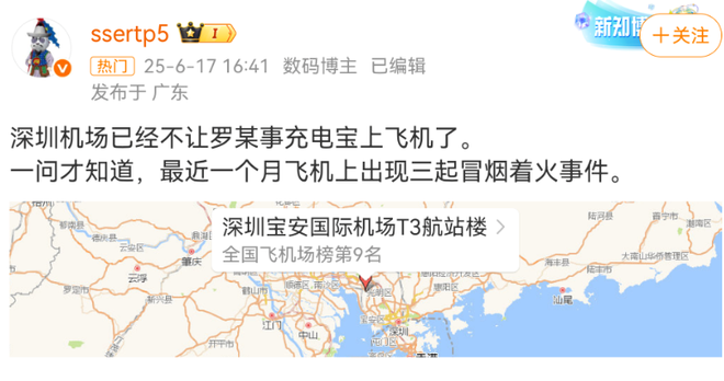 6月17日,博主“ssertp5”发微博称深圳机场已经不让罗马仕充电宝上飞机了,原因是最近一个月飞机上出现三起冒烟着火事件。