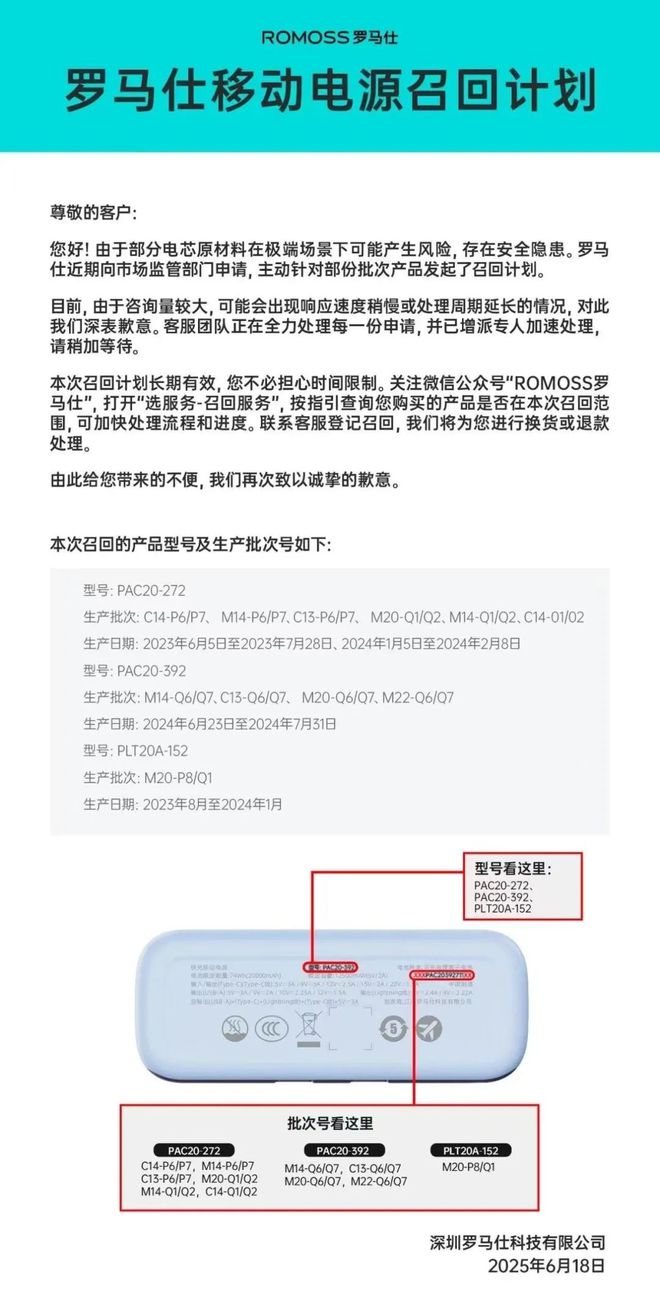 罗马仕于6月16日宣布召回2023年6月5日至2024年7月31日期间生产的491745台移动电源,涉PAC20-272、PAC20-392、PLT20A-152三个型号。