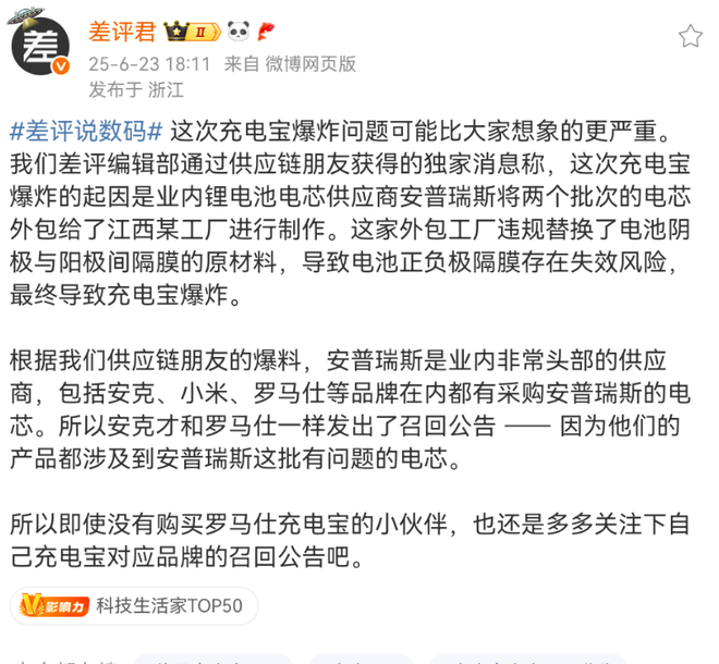 安普瑞斯是业内非常头部的供应商,包括安克、罗马仕等品牌在内都有采购安普瑞斯的电芯。所以安克才和罗马仕一样发出了召回公告 —— 因为他们的产品都涉及到安普瑞斯这批有问题的电芯。即使没有购买罗马仕充电宝的小伙伴,也还是要多多关注下自己充电宝对应品牌的召回公告。”