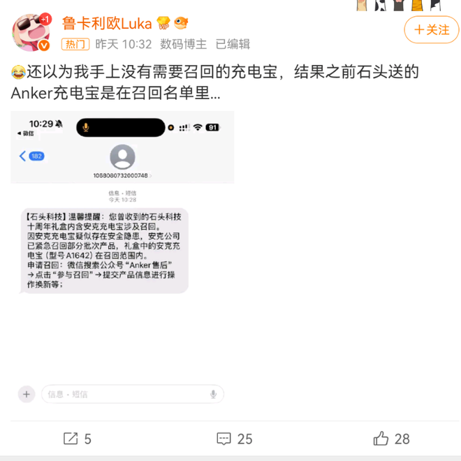 博主 “郭晓光” 发布微博称收到石头科技发来的短信提醒,告知礼盒中的安克充电宝涉及召回,并详细介绍了召回流程