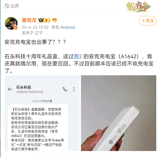 博主 “董晓龙” 表示,自己偶尔使用石头科技送的这款安克充电宝,如今得知要召回,感到十分惊讶,并且提到顺丰已经不收充电宝了。
