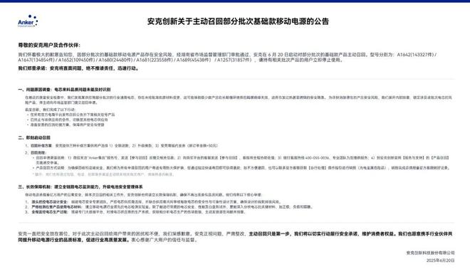6月20日,安克创新发布公告,宣布主动召回型号为A1642/A1647/A1652/A1680/A1681/A1689/A1257的部分批次基础款移动电源,原因是某供应商的行业通用电芯存在未经批准的原材料变更,可能导致隔膜绝缘失效,进而引发过热、燃烧的安全风险。