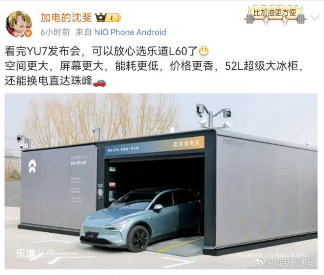 6月27日,蔚来高级副总裁兼乐道汽车总裁沈斐在微博表示,在观看了小米YU7的发布会后,消费者可以放心选择乐道L60。
