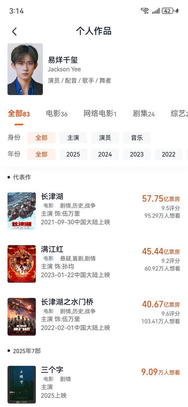 数据显示,易烊千玺出演电影票房前三分别为总票房57.75亿元的《长津湖》、总票房45.44亿元的《满江红》和总票房40.67亿元的《长津湖之水门桥》。他出演的电影《酱园弄·悬案》近期正在热映,票房已破2.73亿元。