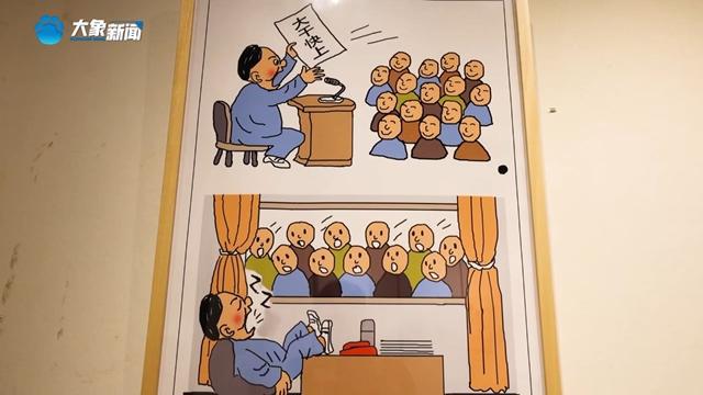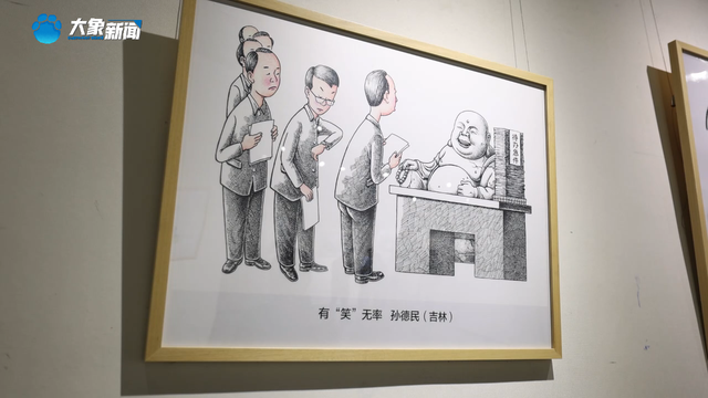“在这幅画上,我们能够看到弥勒佛的脸是微笑的,但是他的左手边是成摞待办的急件,右前方依然还有很多人在排队。”在一幅名为《有“笑”无率》的漫画前,民建河南省委文化艺术委员会副主任、河南科技学院美术与设计学院副院长胡国锋介绍说,“平常给我们的服务态度很好,但是如果说效率上不去,或者说不做事,也是非常麻烦的一件事情,讽刺只有微笑的服务,但是没有实际的效果和效率。”
