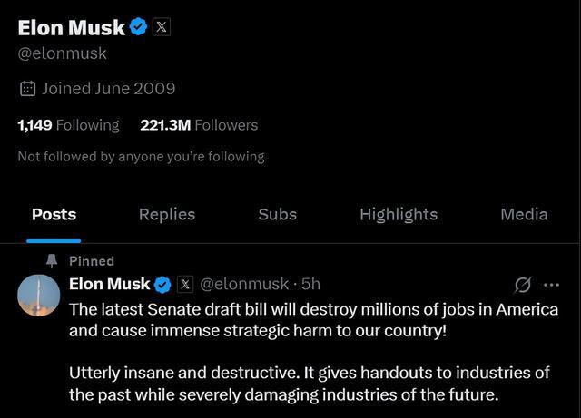 特斯拉首席执行官马斯克也再次抨击该法案。他在社交平台发文说:“最新的参议院草案将摧毁美国数百万个工作岗位,给我们的国家带来巨大的伤害!”