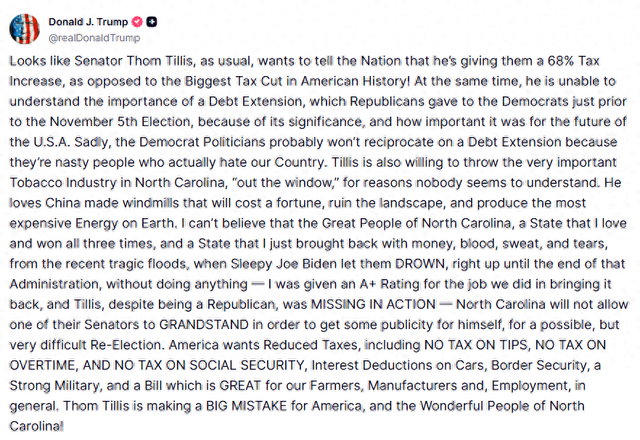 特朗普在社交媒体最新发文道:“看起来参议员汤姆·蒂利斯一如既往地想告诉国民,他正在给他们加税68%——而不是美国历史上最大规模的减税!”特朗普表示,“美国人民要的是减税:小费免税!加班费免税!社保免税!汽车贷款利息抵扣!边境安全!强大军队!还有惠及农民、制造商和就业的优质法案!汤姆·蒂利斯正在为美国和北卡莱罗纳的优秀民众犯下重大错误!”