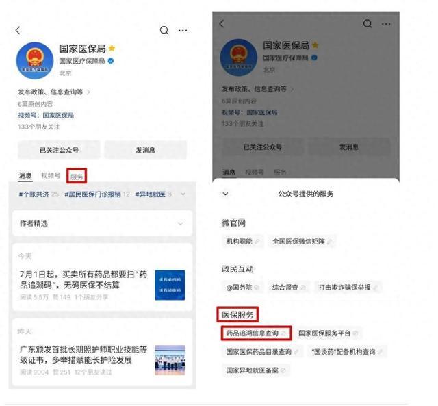第一步:进入“国家医保局”微信公众号主页,点击服务→药品追溯信息查询,进入查询页面;