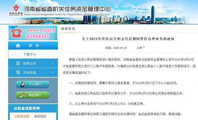 6月23日,河南省直住房公积金管理中心发布关于年度结息期间暂停办理业务的通知,这笔钱河南人注意查收。