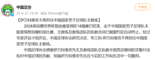 此前,6月26日,中国足协官宣伊万卸任: