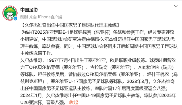 为做好2025东亚足联E-1足球锦标赛(东亚杯)备战和参赛工作,经过专家评议小组评议,中国足球协会研究决定由德扬·久尔杰维奇担任中国国家男子足球队代理主教练,率队参赛。同时,中国足球协会将同步开启新周期中国国家男子足球队主教练选聘工作。