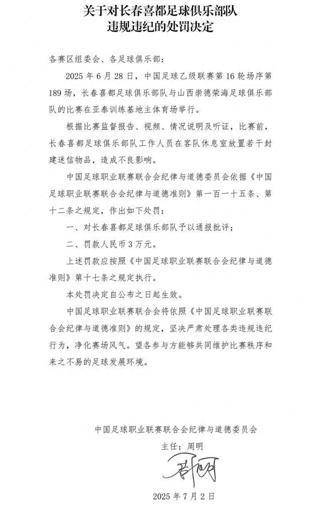 根据比赛监督报告、视频、情况说明及听证,比赛前,长春喜都足球俱乐部队工作人员在客队休息室放置若干封建迷信物品,造成不良影响。