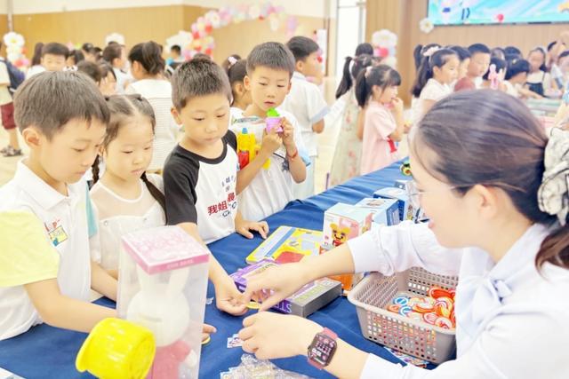 老师化身“商场设计师”,将兑换区打造成小型“购物天堂”,奖品清单堪称“萌娃心愿合集”:铅笔、橡皮、钢笔、ins风收纳袋……各类文具都赫然在列;彩色跳绳、卡通沙包、适合课间比拼的拼装积木……让校园里的动与静的需求都被照顾;童话绘本、科普读物、成语故事书……书架上满满当当,不少萌娃踮着脚挑选适合自己“精神零食”。此刻,孩子们手中的附小币已化作了一把把开启快乐的钥匙,他们仔细地比较、慎重地选择,用自己辛勤挣来的附小币换取心仪的奖品。这不仅是一次物质的交换,更是对孩子们积极向上、规范自律精神的莫大认可与鼓舞。