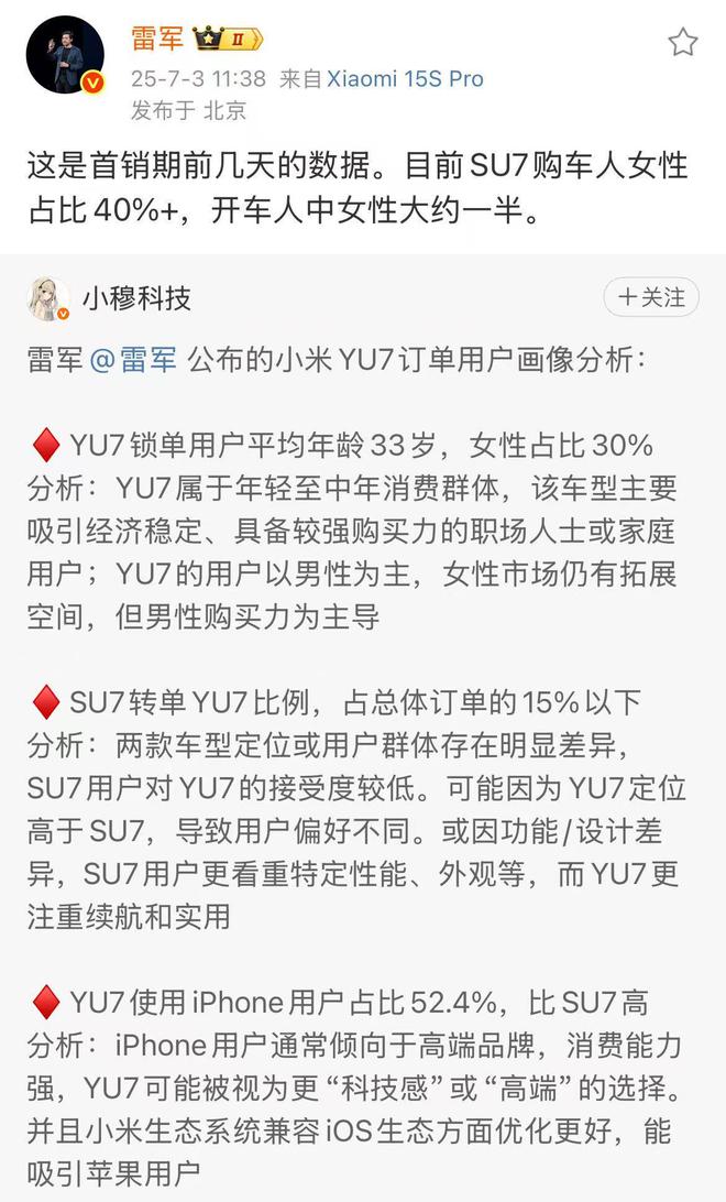昨日雷军公布了小米YU7用户画像: