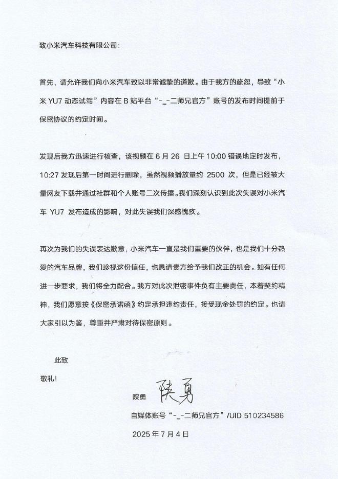 就提前发布小米YU7试驾视频,汽车博主二师兄今日致歉。