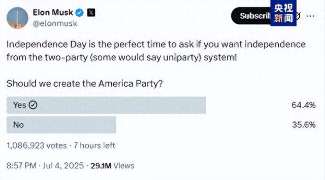 当地时间7月4日,美国企业家埃隆·马斯克再次在社交平台上发布有关建立新党派“美国党”的投票。截至目前,已经有超过108万个账号参与投票,其中64.4%选择了“是”,35.6%选择了“否”。