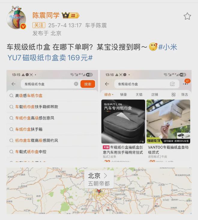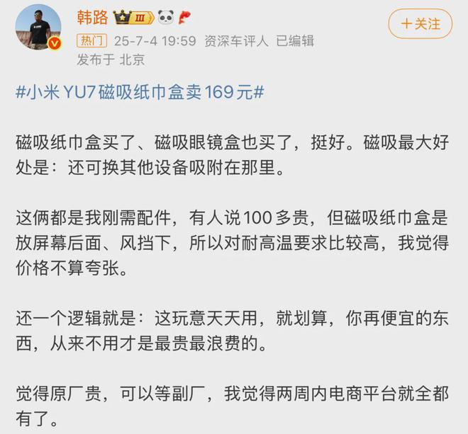 昨日,#小米YU7磁吸纸巾盒卖169元#上热搜,五分之二的汽车博主都在讨论,包括陈震。一个纸巾盒讨论了一天。