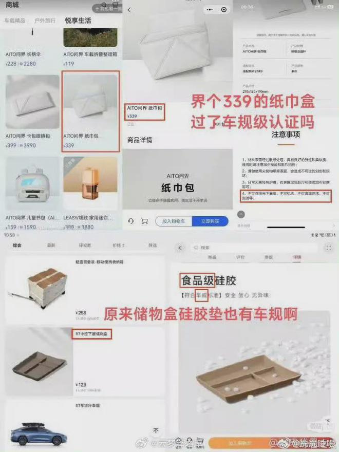 “但是随着讨论的深入,各家车规级纸巾盒和储物格的价格纷纷被扒了出来,然后大家伙儿发现,tm小米居然是最便宜的?甚至某家一点皮革没有,不可放在阳光下暴晒、不可高温烘烤的纸巾包,居然卖到了339,那我要这玩意儿放车上干嘛?”
