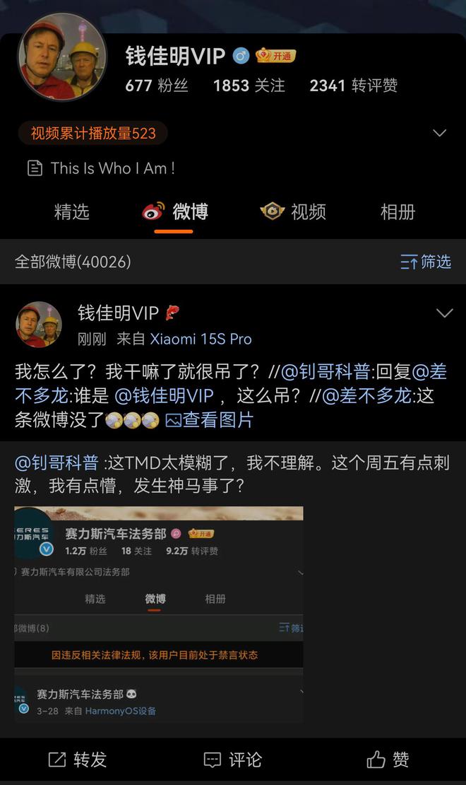7月4日,三言注意到赛力斯汽车法务部微博账号显示,因违反相关法律法规被禁言。