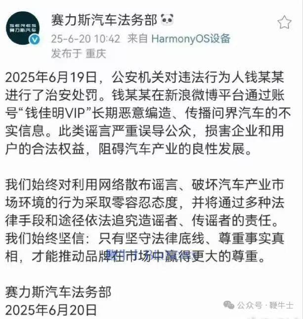 其6月20号关于钱某某因长期编造问界不实信息被公安机关治安处罚的公告已消失。
