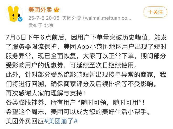 美团外卖今日发文称,7月5日下午6点前后,因用户下单量突破历史峰值,触发了服务器限流保护,美团App小范围地区用户出现了短时服务异常,现已全面恢复,大家可以正常下单。期间部分受影响用户的优惠券,可延续至次日继续使用。